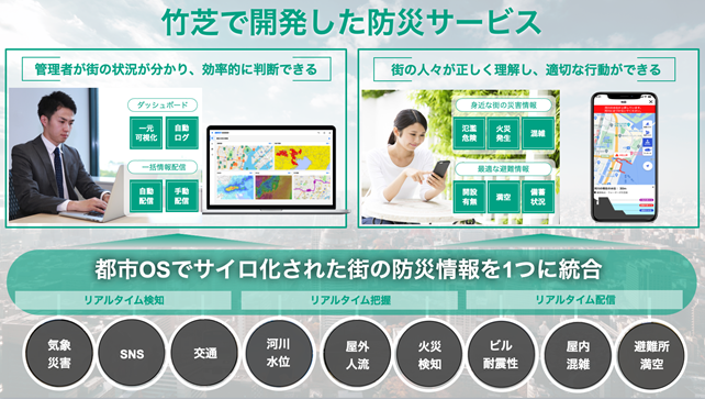 ソフトバンクは、このような課題の解決に向けて、サイロ化された街の防災情報を一つに統合し、街の状況をリアルタイムに把握して情報発信できる防災サービスを開発しました。また、東急不動産とソフトバンクは、この防災サービスを基に自治体が情報収集を効率化する「統合管理UI」を構築して、豪雨発生時の対応の効率化を検証する実証実験を2022年12月に行い、災害時の情報の収集・発信など複数の作業において所要時間を約50%以上削減できることを検証しました。街の情報を含めて災害時の情報を一元管理できるシステムは、自治体の担当者やエリアマネジメント組織の管理者、施設管理者らが、運営の判断や情報収集、施設から来館者への情報発信などに活用できます。この実証実験を通して機能の改善などを行った上で、竹芝地区の情報を統合管理・発信する防災サービスとして、竹芝エリアマネジメントが導入します。
