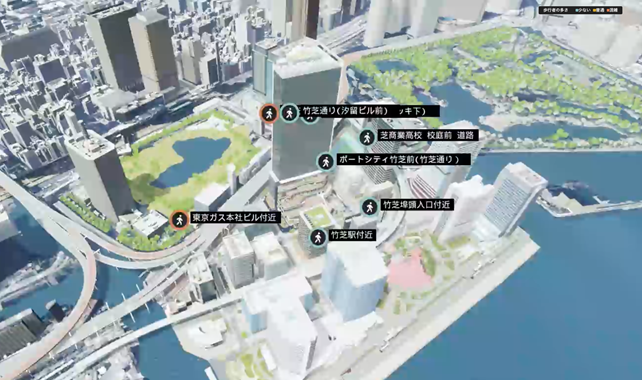 そこで、東急不動産とソフトバンクは、正確さや精度を追求した3D都市データの制作技術とハイクオリティーなコンテンツの表現力を持つ株式会社キャドセンターや、クラウドを活用したアプリケーション、AI(人工知能)/IoT(モノのインターネット)の開発に強みを持つ株式会社Fusicと共に、竹芝地区のデジタルツインを構築し、自治体と施設間の情報連携や来訪者の一時滞在施設への避難、一時滞在施設における入館時の受け入れ対応などの効率化を検証しました。自治体や施設管理者から、一時滞在施設の開設情報や満空情報を、「LINE」などを通して帰宅困難者に伝えることで、施設へのスムーズな誘導や受け入れが可能になります。検証では正確性や迅速性、省力性などについて高い評価が得られ、受け入れ対応においては約70%以上の効率化につながるという結果になりました。今後、検証で得られた結果を踏まえて、自治体や施設管理者、帰宅困難者などがリアルタイムに情報を把握して共通認識を持ち、円滑な避難行動を起こせる環境と仕組みを構築していきます。また、東急不動産は検証した一部の機能を2023年4月から東京ポートシティ竹芝に実装しており、災害発生時に円滑な避難誘導を実施することで、安全・安心な施設運営に取り組んでいます。