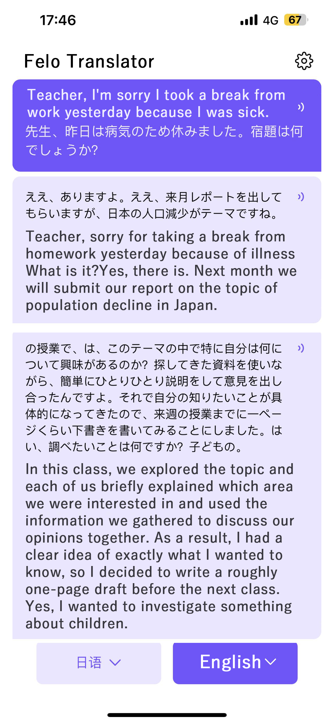 例えば、海外旅行先で「現地の言葉が通じない」というジレンマに陥ったとき。 Felo Translatorを開けば、相手の音声をテキストに翻訳してくれるので、相手の言いたいことを簡単に理解することができます。 同時に、自分の文章を相手の言語に翻訳し、音声で再生することもできるので、お互いのコミュニケーションがより円滑に、より自然になります。