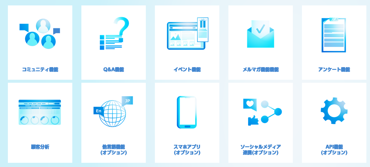 ノーコードではなくパッケージ型でありながら、コミュニティサイトを構築するために必要な20以上の標準機能があります。また、オプション機能も豊富に揃えており、ご要望に応じてカスタマイズすることができます。