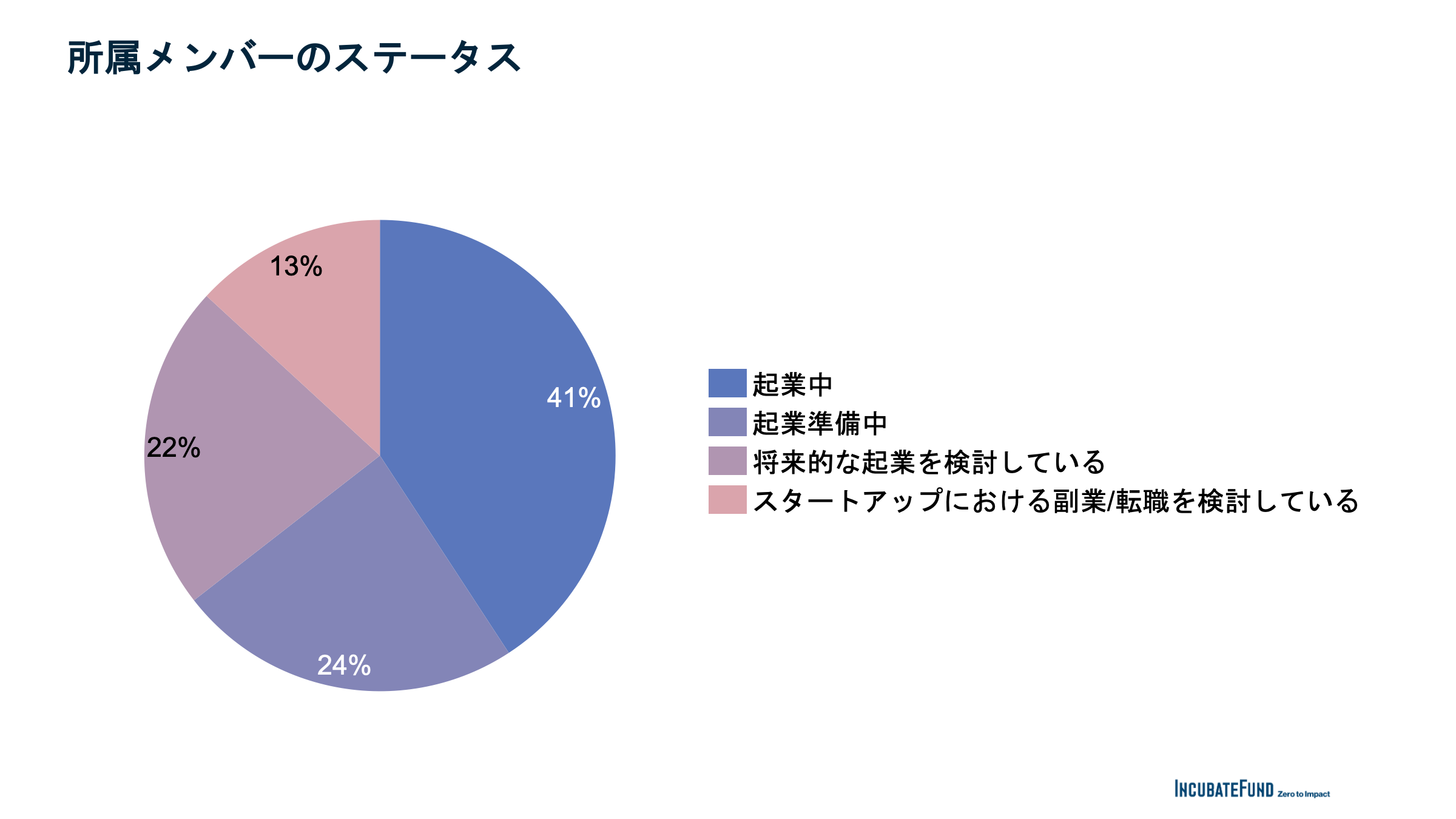 2023年6月5日時点で151名のメンバーが参加しており、うち87%が起業中・起業準備中・将来的な起業を検討しているステータスです。起業前ステータスの参加メンバーの現職はスタートアップやメガベンチャー、外資IT、日系製造業、コンサルティングファームなど様々です。