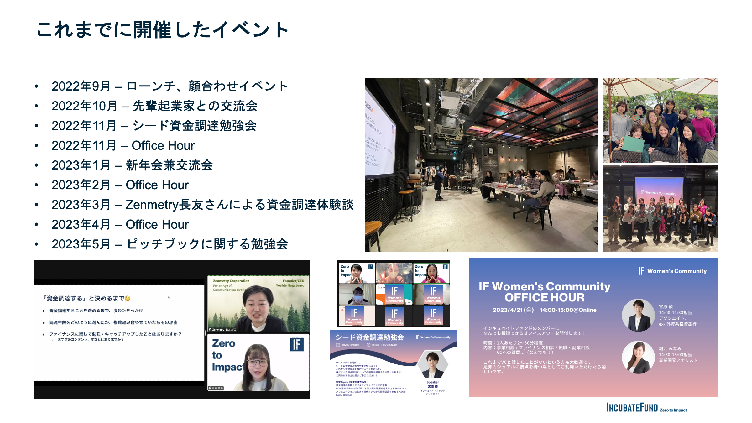 このような課題に対し、2022年9月にインキュベイトファンドの有志女性メンバーにてIF Women’s Communityを立ち上げました。国内外のスタートアップに関する情報提供やIF含むVCとのカジュアルなコネクション、近しい環境の女性との横のつながり等を提供しています。