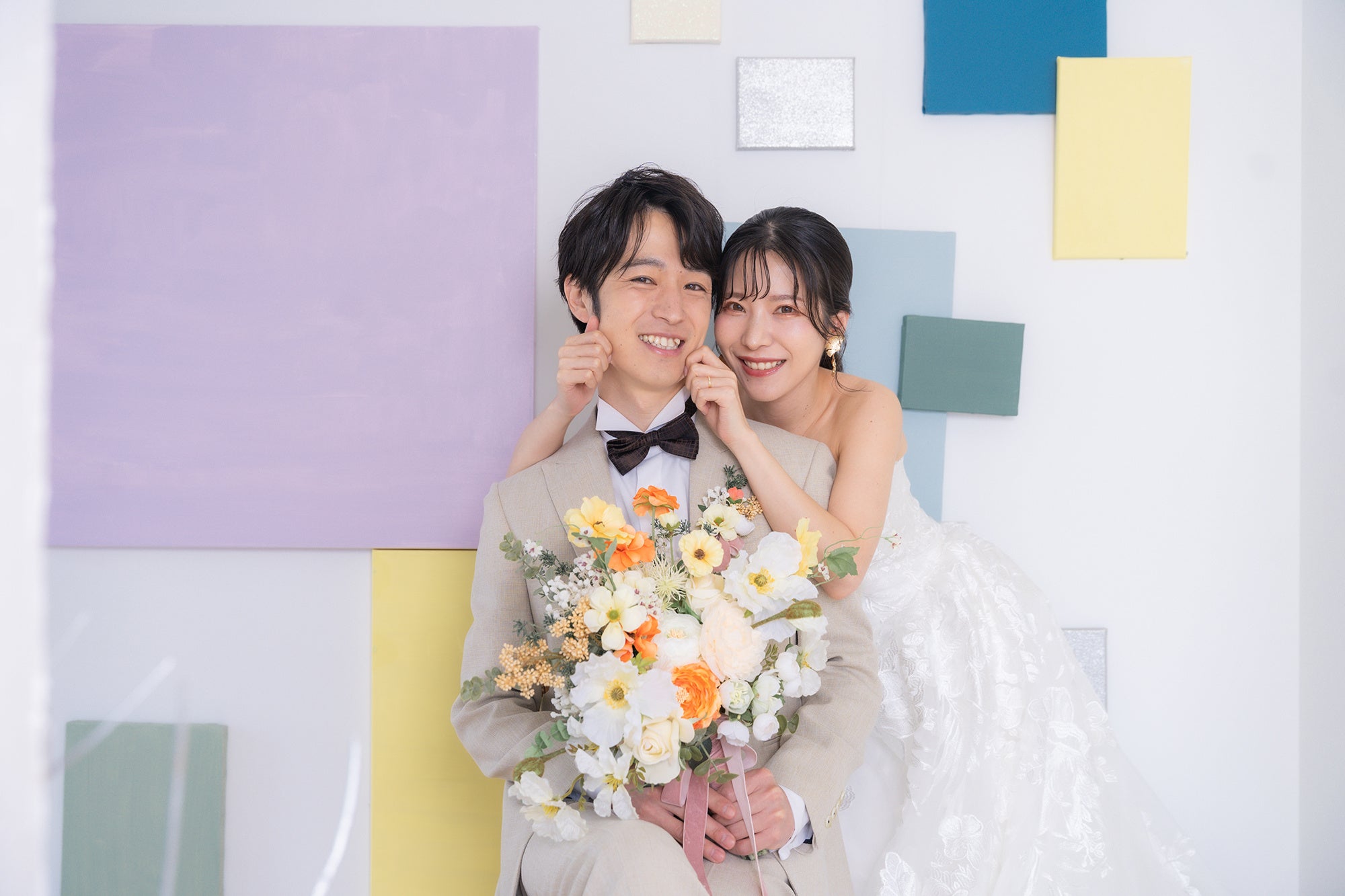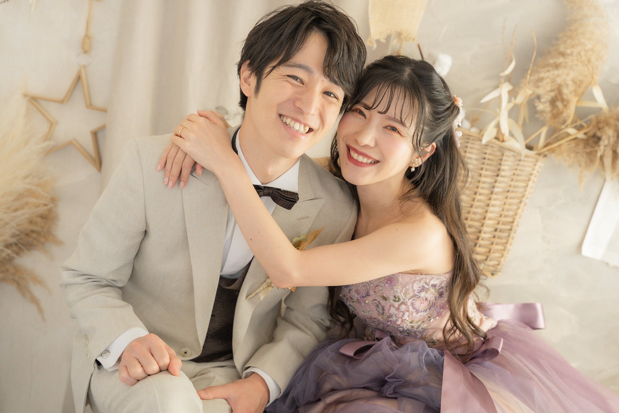 ・撮影一式(新郎新婦スタンダード衣装各1着・着付け・小物一式・ブーケ&ブートニア(洋装の場合)・アクセサリー・新婦へアメイク・スタジオ使用料・ 写真撮影)
