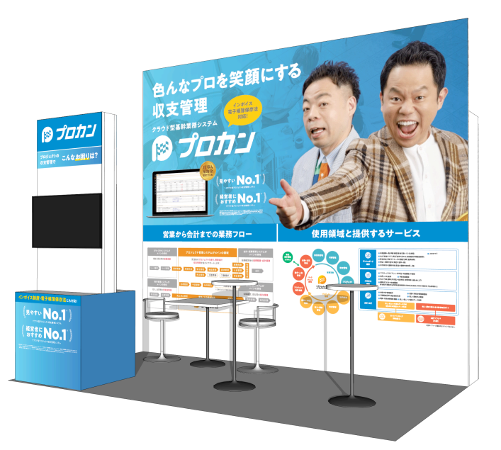プロカンの強みである、「案件管理」「利益の見える化」「業務効率化」を具体的にイメージできるような展示内容です。ぜひお立ち寄りください。