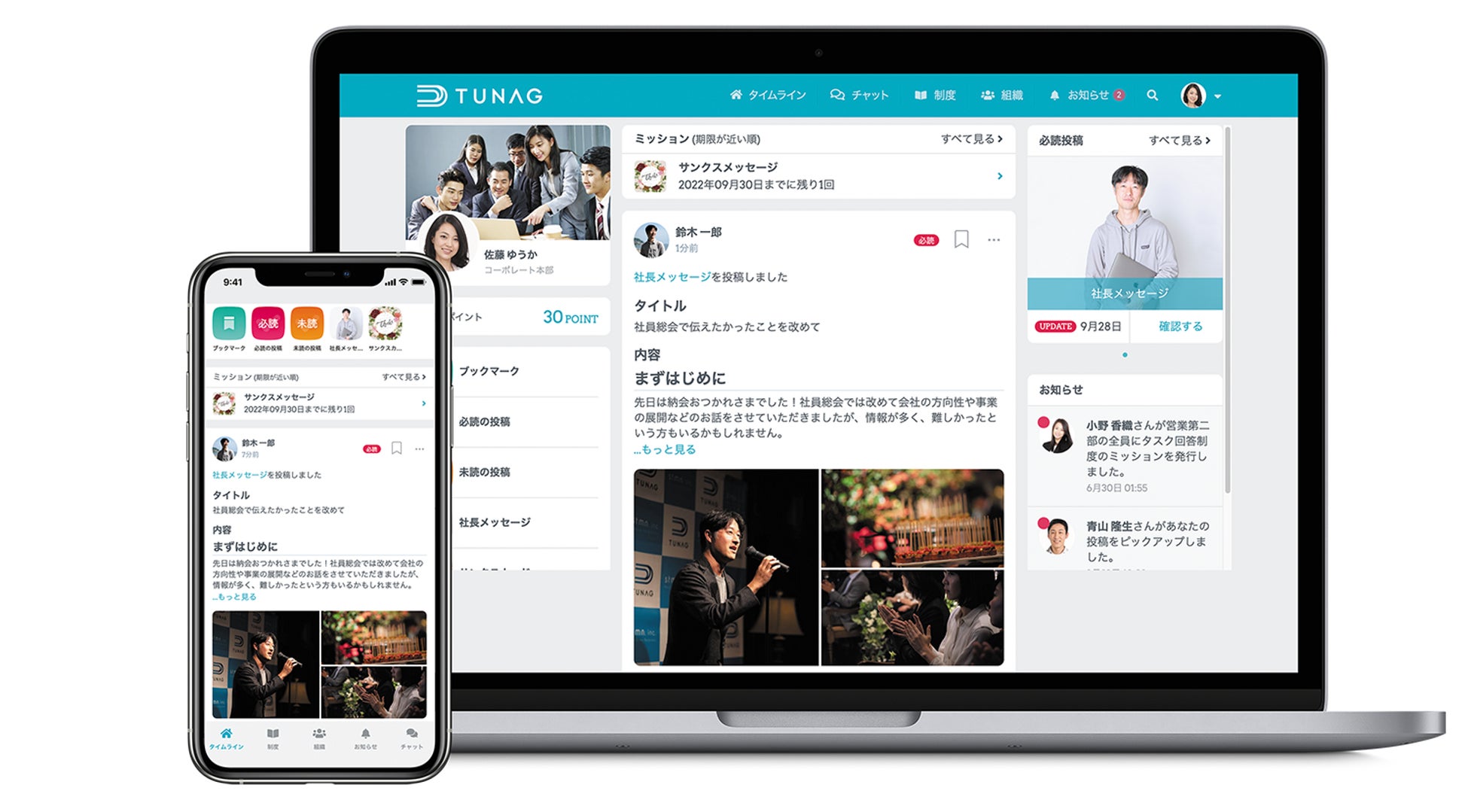 TUNAGについて「TUNAG」は、組織のエンゲージメント(=会社と従業員、従業員同士の相互信頼関係)向上を支援していくための機能をパッケージで幅広く提供するクラウド型プラットフォームサービスです。「社内制度」を軸としたコミュニケーションを設計することでエンゲージメントを高め、強い組織づくりを支援します。従業員数一万名超のグローバル企業から、十数人の企業や団体まで、規模や業種、業態を問わず様々な企業でご導入いただいております。