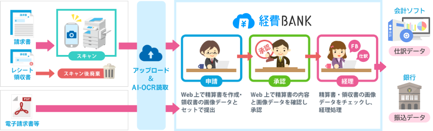 「経費BANK」は、月額1,500円から利用できるクラウド型経費精算システムです。スマートフォンやタブレット端末で、いつでもどこからでも申請や承認ができる上、取引先への支払依頼と支払予定表による支払管理、経費集計による経費分析、銀行振込データ及び会計仕訳データの作成機能により、経理業務効率化を実現します。