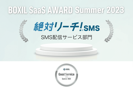 このたび、「絶対リーチ!SMS」が、SaaS比較サイト「BOXIL SaaS」を運営するスマートキャンプが主催する、優れたSaaSを審査、選考、表彰するイベント「BOXIL SaaS AWARD Summer 2023(以下、本AWARD)」において、SMS送信サービス部門の「Good Service」を受賞しました。本AWARDは、2022年4月1日から2023年3月31日までの1年間で新たに投稿された口コミ約16,000件を審査対象としています。「Good Service」は、「BOXIL SaaS」上に投稿された口コミを対象に、各カテゴリで総得点の高いサービスに対して付与されるものです。