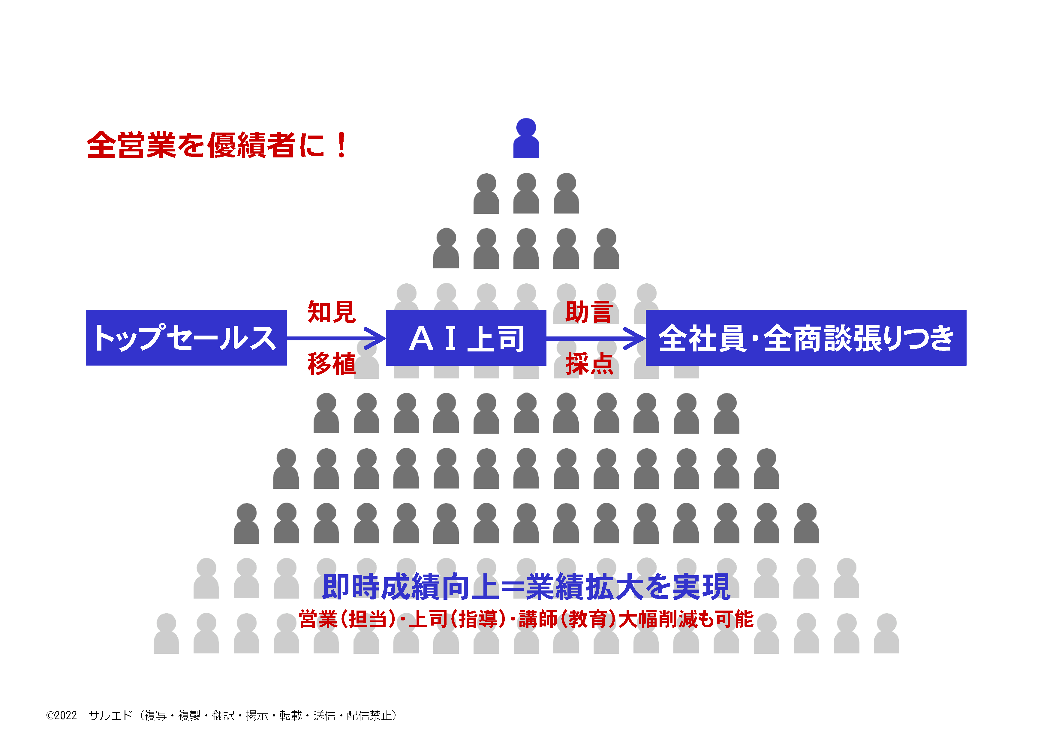 「トップセールス」が社員に張りつき、案件の進捗と着地をナビゲートするイメージである。