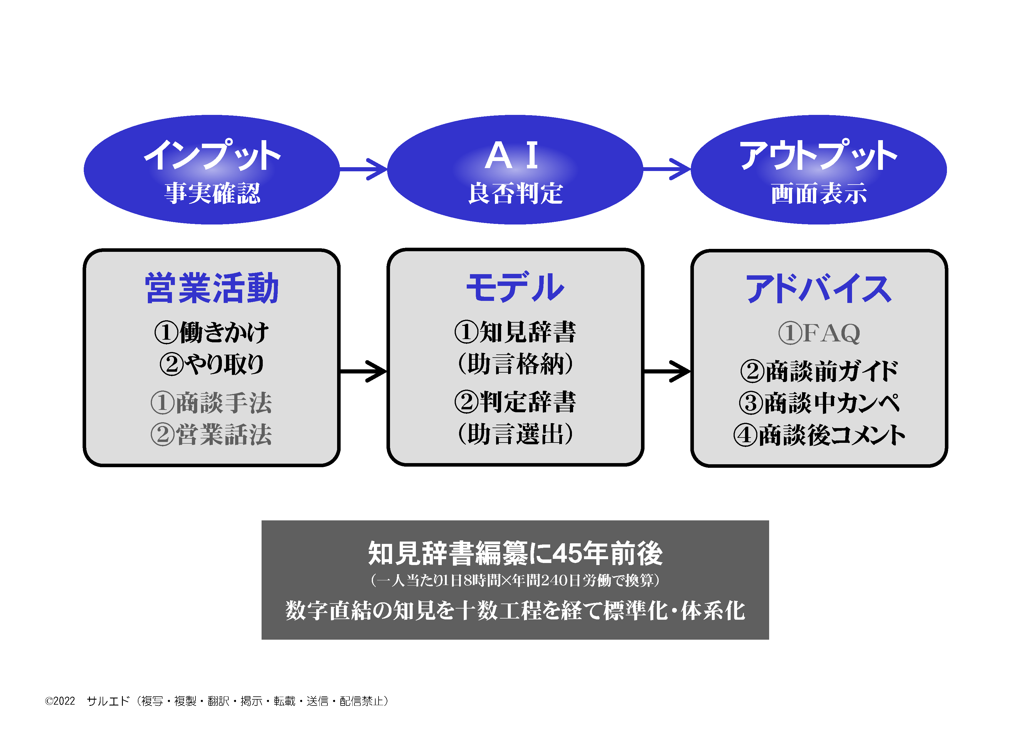 辞書格納のエキスパートシステムを基本としてディープラーニングを付加し、商談前にヒント・ポイント、商談中にカンペ、商談後にスコア・コメントを表示する。