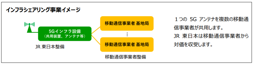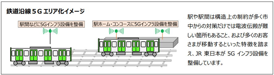 5Gは産業・社会のデジタル化を支える基盤技術の一つであり、JR東日本はインフラシェアリング事業者として駅や駅間など多くのお客さまがご利用する鉄道沿線に5Gインフラ設備をスピード感をもって整備し、移動通信事業者に提供することで、社会全体のインフラ投資の最適化、社会課題の解決、およびお客さまの利便性向上を目指します。