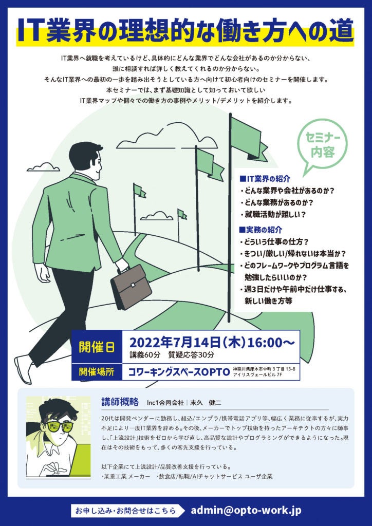 OPTO では、IT業界へ就職を考えているけど、具体的にどんな業界でどんな会社があるのか分からない、誰に相談すれば詳しく教えてくれるのか分からない。そんなIT業界への最初の一歩を踏み出そうとしている方へ向けて初心者向けのセミナーを開催します。本セミナーでは、まず基礎知識として知っておいて欲しいIT業界マップや個々での働き方の事例やメリット/デメリットを紹介します。