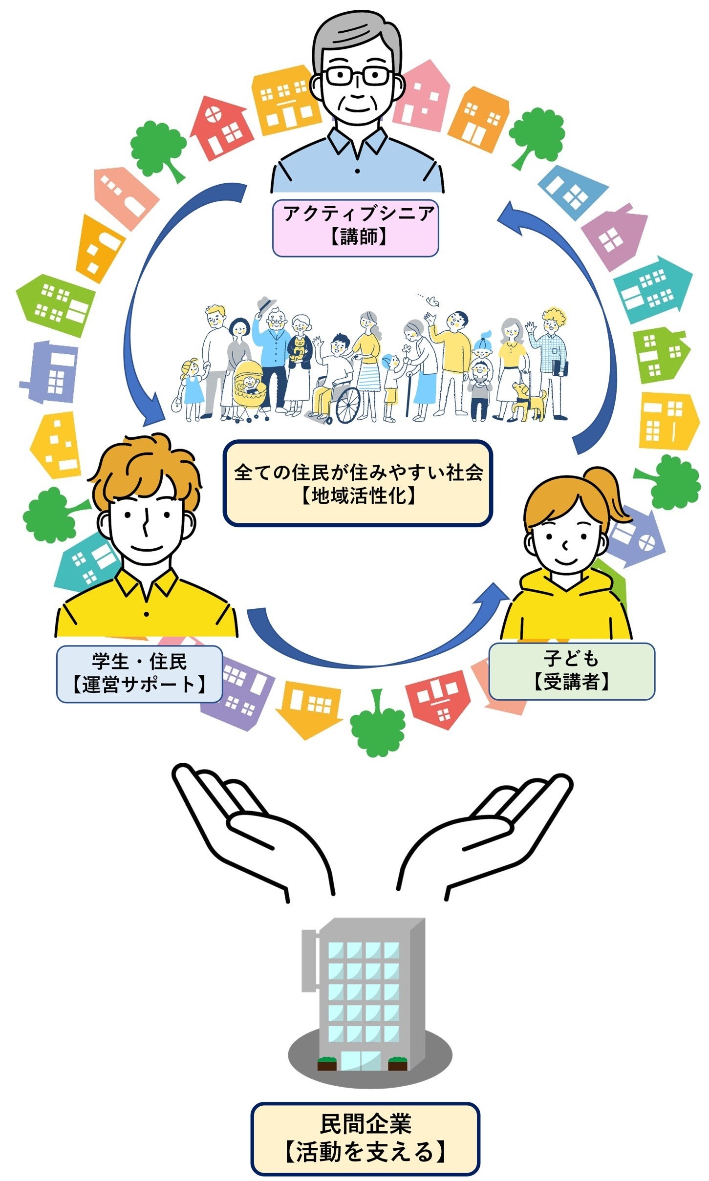 今後は、経験豊富な地域のアクティブシニアの方を講師として迎え、指導・運営・受講を地域内で行います。