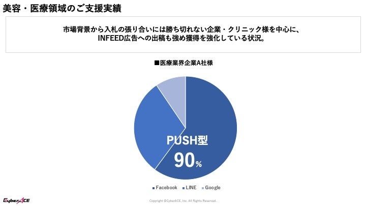 市場背景から、入札の張り合いには勝ちきれない企業・クリニック様を中心に、INFEED広告への出稿を強め獲得強化もしております。