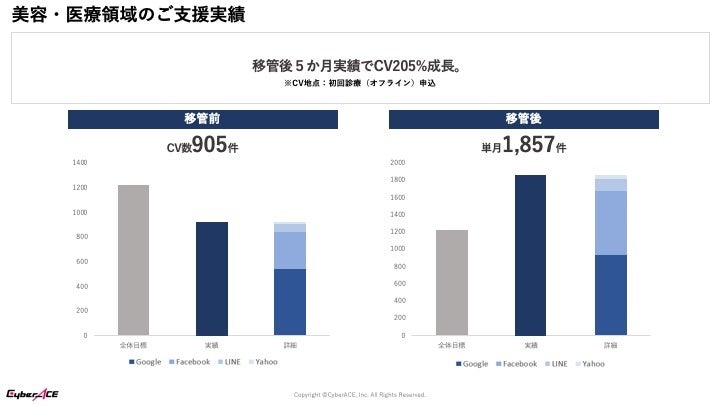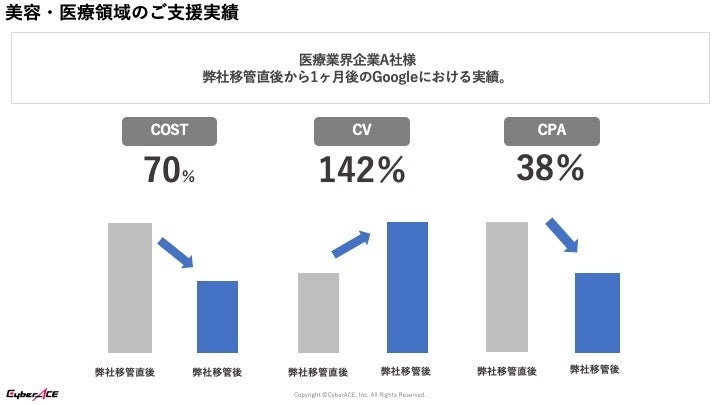 今回、医療・美容クリニックのマーケティング戦略に関する調査を実施した、株式会社CyberACE(https://cyberace.co.jp/)は、業種特化した専任のプランニング・運用体制により顧客の事業に伴走し、広告効果の最大化・効率化を図り顧客満足度の高いサービスを提供しています。さらに、オフライン/オンライン両データを統合した基盤構築からデータの活用までの一気通貫のご支援も行っており、顧客の成果地点に合わせた適切な運用が可能です。