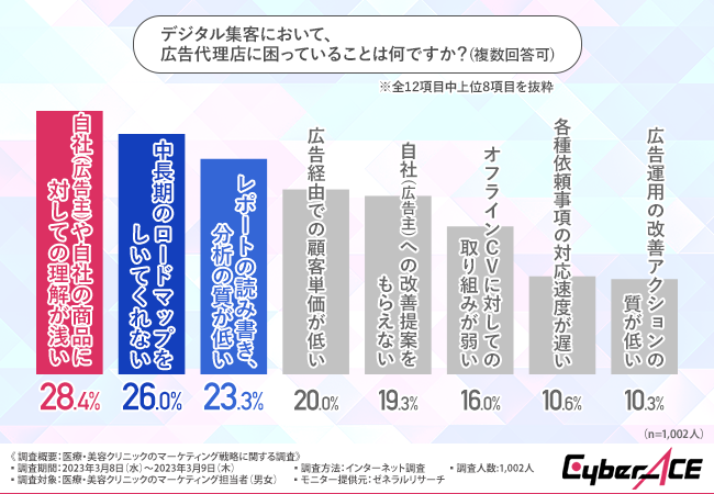 医療・美容クリニックの集客において、広告代理店に集客を依頼している方の中で広告代理店に対し困っていることとして、「自社への理解」「中長期のロードマップ」などの悩みが上位に上がりました。