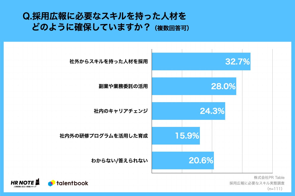 自身のスキルアップのみでは補えないスキル不足については、32.7%が「社外の専門人材を採用」、28%が「副業や業務委託の活用」をしており、24.3%が「社内キャリアチェンジ」を選択しました。