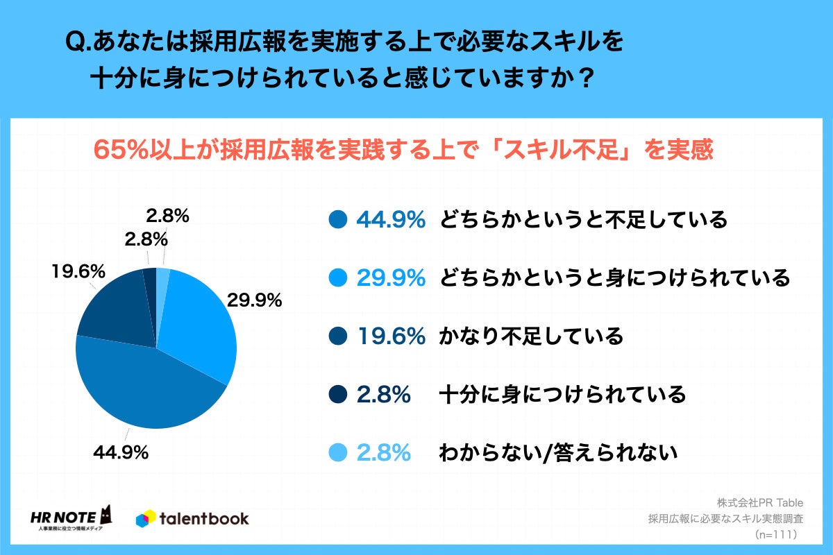一方、採用広報を実践する上で必要なスキルについては「どちらかというと不足」「かなり不足」の合計が65%以上となり、多くの人事・採用広報担当者がスキル不足に課題を実感していることがわかりました。
