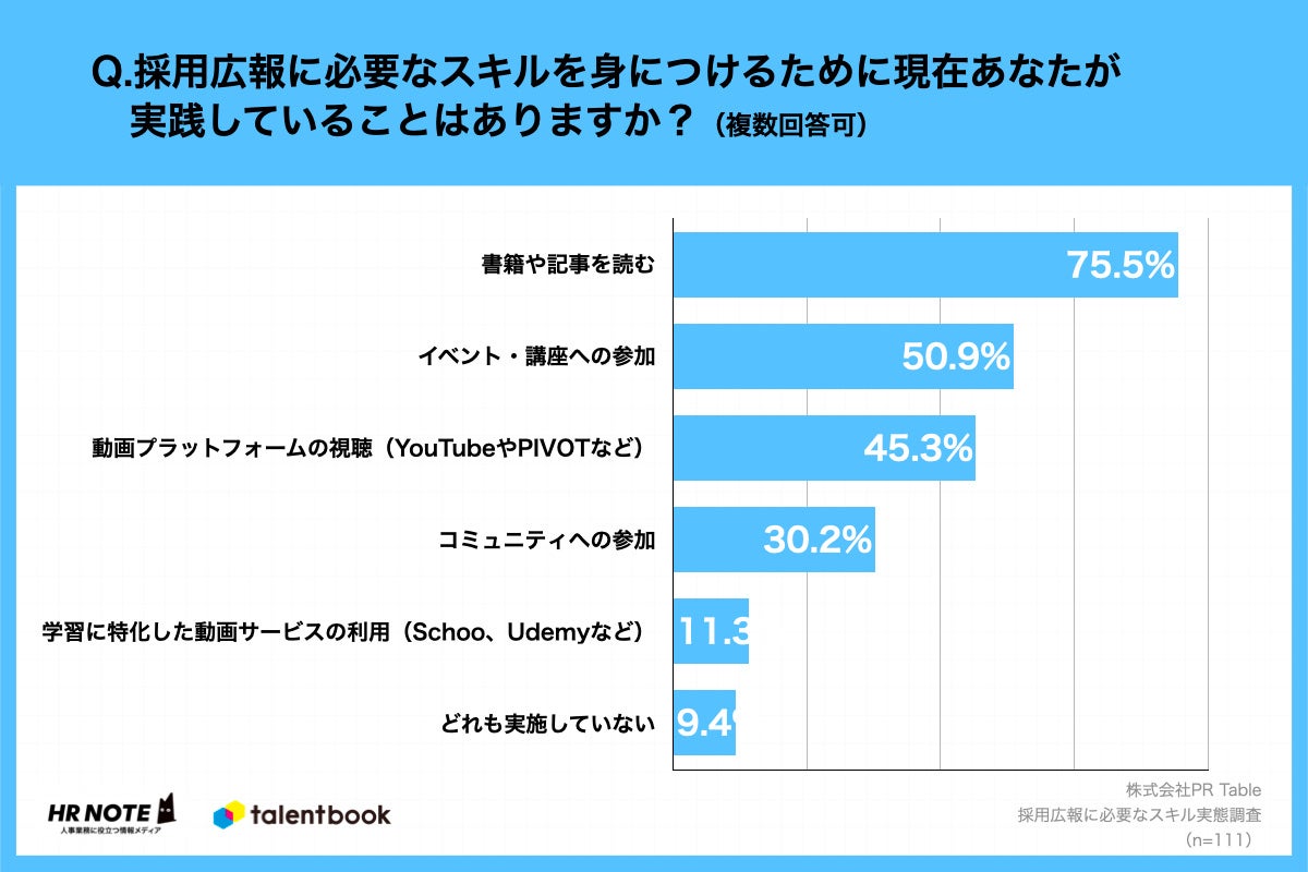 採用広報に必要なスキルを身につけるために、75%以上が「書籍や記事を読む」、50%が「イベント・講座への参加」をしており、さらにスキル取得目的でYouTubeなどの「動画プラットフォーム」をスキル取得目的で視聴している方も45.3%いることがわかりました。