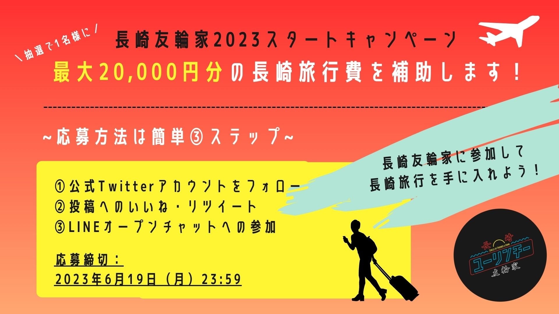 2023年のスタートを記念して、期間中に長崎友輪家 LINEオープンチャットにご参加いただいた方の中から抽選で1名様の長崎県外から県内までの交通費・宿泊費を最大2万円まで補助いたします。