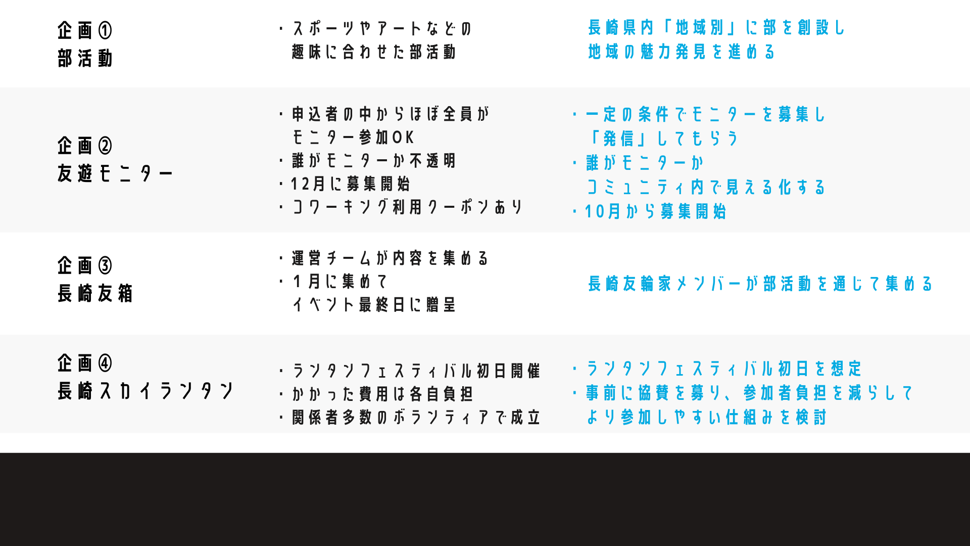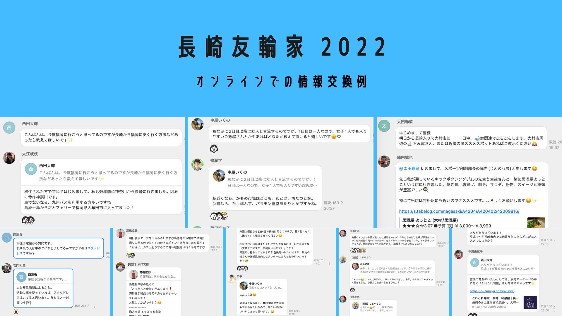 また、イベント企画に限らず、毎月1回以上の交流会を開催するほか、日常的な交流も発生。「これから長崎に移住する方の質問」や「各地の住民だから教えられる隠れスポット(グルメ)」などの情報交換や「花見」「ハタ揚げ大会」「県人会」のお誘いなど、長崎友輪家があったからこそ生まれた交流も多数、自発的に発生し、居住地に関わらず多数の出会いが生まれました。