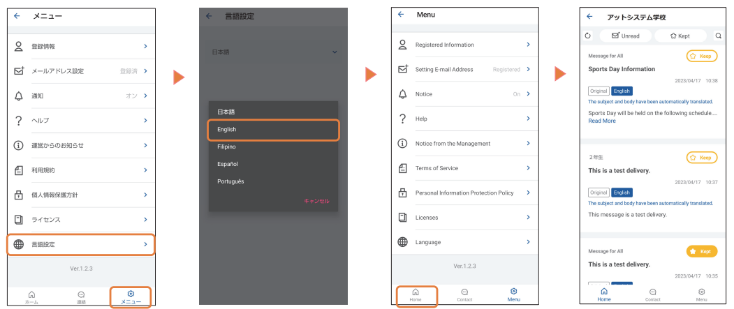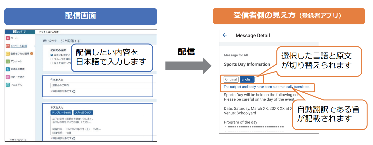 日本語でメッセージを配信いただくと、受信者アプリで選択した言語に応じて自動翻訳された表示となるため、配信側で特別な操作は不要です。翻訳言語を意識せずにご利用いただけます。