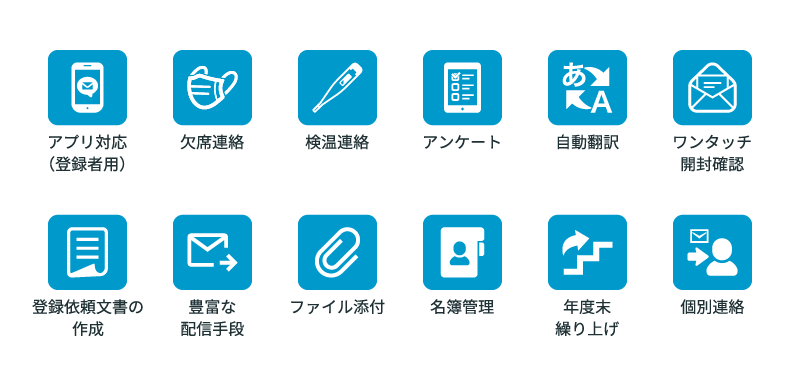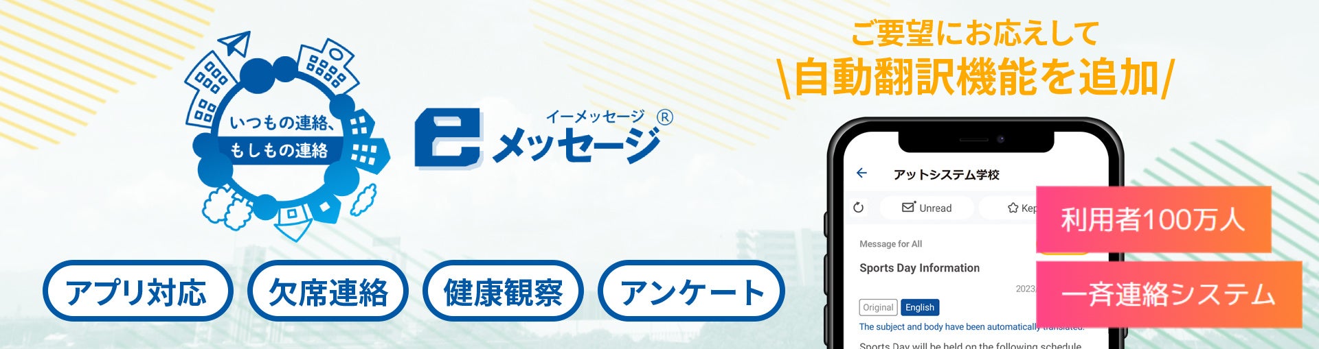 「eメッセージ」は、保育園・幼稚園・ 小中学校・高等学校や各種団体など全国1,500団体以上、100万人以上の方々にご利用いただいている「緊急時」と「平常時」の機能を兼ね備えた、シンプルかつ高性能な「一斉連絡システム」です。