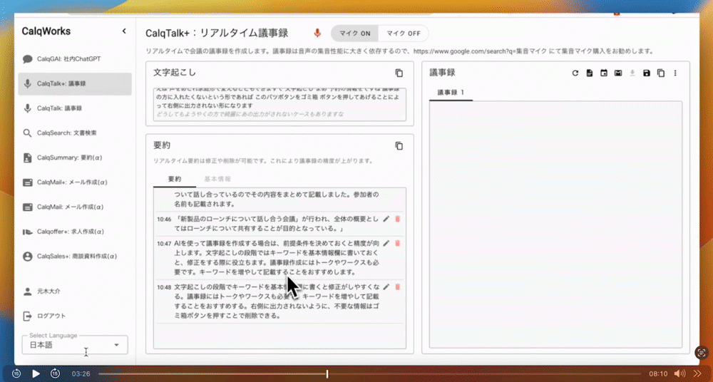 CalqTalk+はリアルタイム議事録生成AIで、ミーティングの生産性を向上させます。具体的には以下12項目の内容を自動生成します: