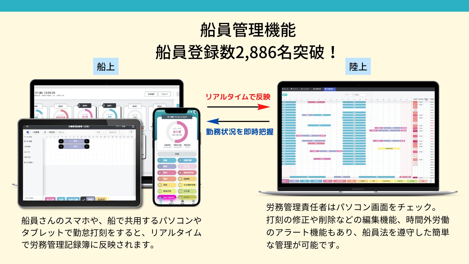 そんな中、2022年4月国土交通省は海事産業のDX化を支援すると共に、「船員の働き方改革」を推進する船員法を発表しました。労働環境の改善による働き手の確保と同時に、抜本的な業務効率化が早急に求められています。