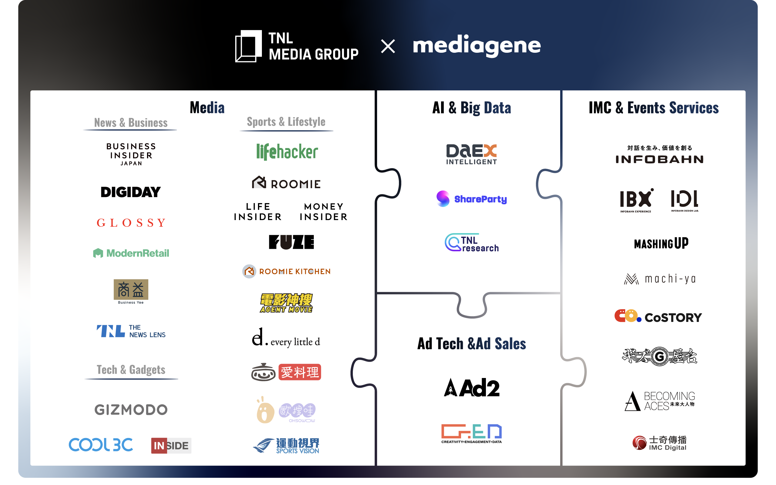 このたび、株式会社メディアジーン(以下、メディアジーン)は、2023年5月26日付で「TNLメディアジーン」(以下、TNLMG)との株式交換により、アジア全域をカバーする台湾最大のメディア企業の一つであるThe News Lens Co.(以下、TNL)とグループ企業となりました。