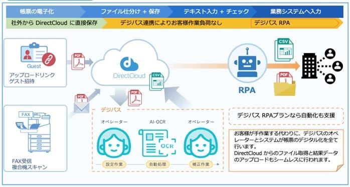 DirectCloudは、協力会社など社外からのファイルアップロードや、複合機連携などにより、自社内の人の手を掛けずにファイルをクラウドストレージに格納することができます。