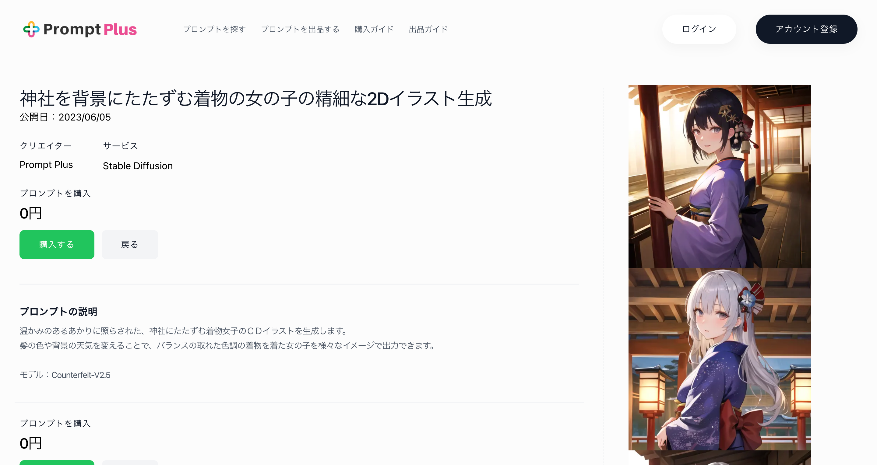 Prompt Plusでは多くの高品質なプロンプトを取り扱っており、ChatGPTでうまく答えを引き出すためのプロンプトや、Stable DiffusionやMidjourney等を通してアニメのような画像を生成するプロンプトなどを簡単に手に入れることができます。