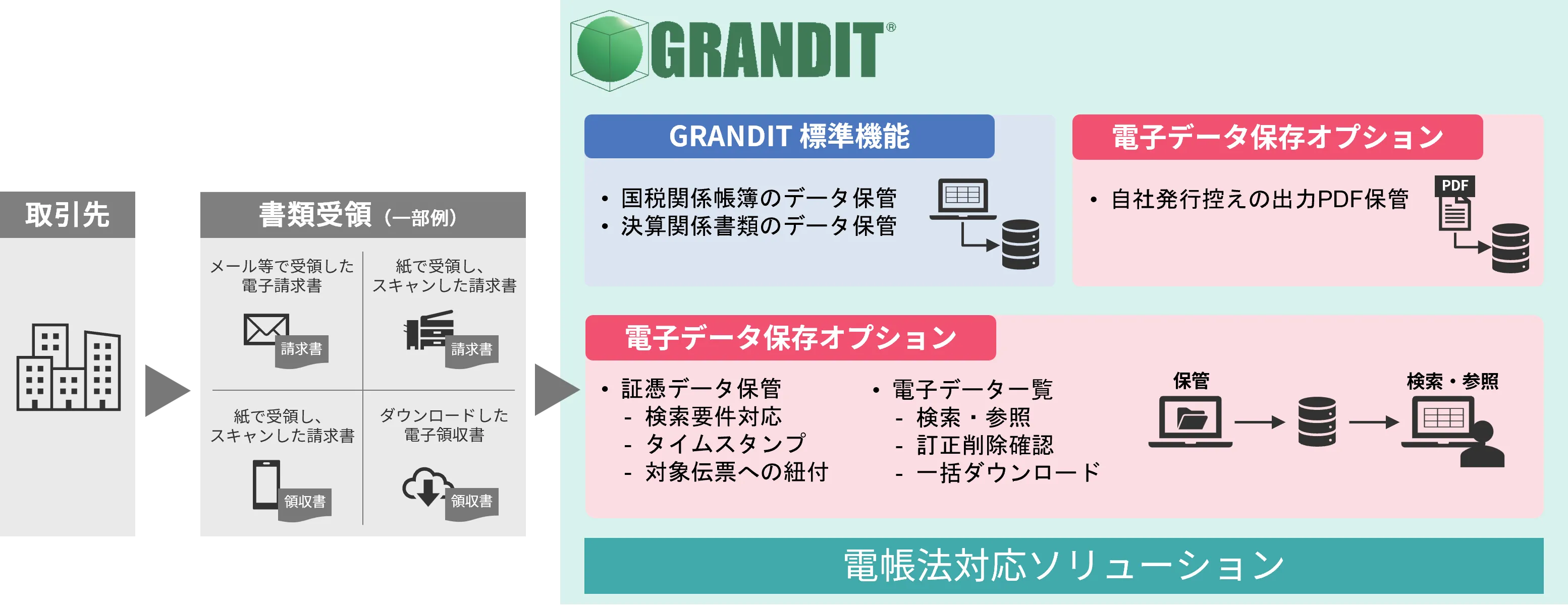 本オプションを利用することで、GRANDITの標準機能だけでは対応が困難であった「スキャナ保存」に対応することができます。