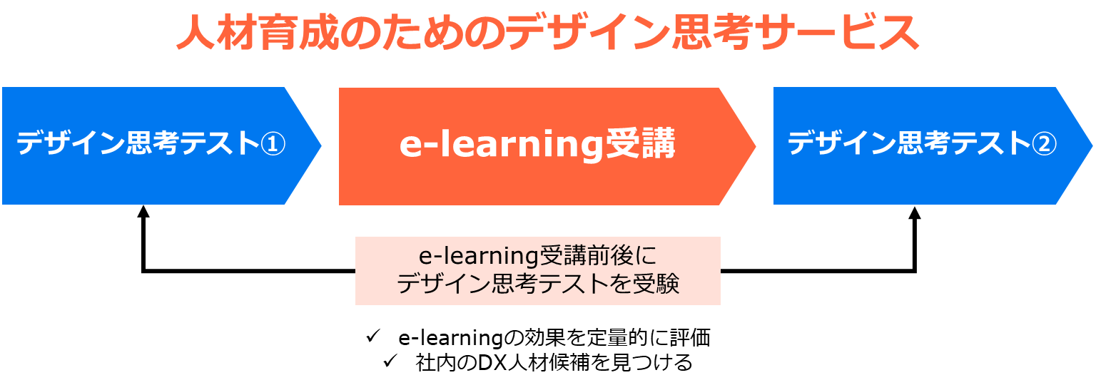 ハンズオン形式のe-learning研修でワークをしながら学習を進め、デザイン思考テストで研修成果を定量的に評価し、業務におけるデザイン思考の実践力を身につけます。