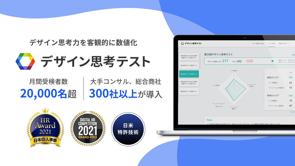 デザイン思考テストとは、VISITS Technologies株式会社が独自開発した世界初の「デザイン思考力」を測るテストで、 イノベーション創発に必要とされるデザイン思考プロセス(共感・問題定義・アイデア創造・プロトタイプ・テスト)を 自ら高速で回し、事業を創造していく力を測定するためのオンラインテストです。