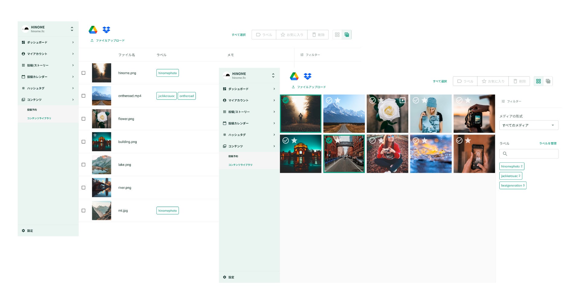 PC・スマホから画像・動画などをHINOME上にコンテンツをアップロードすることが可能となります。これまでメールや別ツールを利用し、保存されていた手間をかける必要がなくなります。