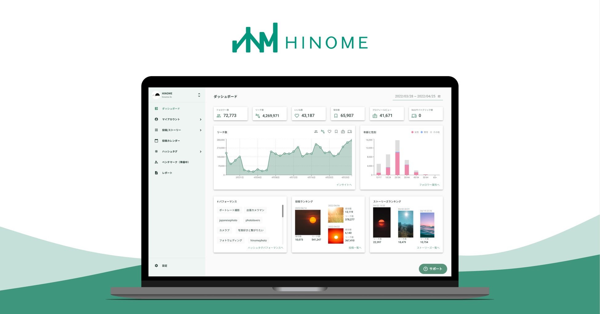 『HINOME』は、無料で豊富な機能が利⽤可能なInstagram分析ツールです。基本的なデータ分析はもちろん、Instagram運⽤で重要だと⾔われている、投稿してから24時間のインサイト推移が把握できる「初速分析」と、時間と⼿間のかかる「ハッシュタグのレコメンド機能」が搭載されています。さらに、β版リリース後より⾃社の⽬的に合わせて必要な情報をクリックひとつで出力可能なレポーティング機能・カレンダー表⽰・ベンチマーク機能・UGC投稿機能を搭載しました。もちろんセキュリティー⾯においても、最新の公式InstagramAPIにて開発しているため、安⼼してお使いいただけます。本リリースから約8ヶ月で10,000アカウントが登録され、⼤変好評をいただいております。今後もさらに開発を⾏っていく予定であり、より⼀層お客様にご満⾜いただけるツールとなっておりますので、ぜひご活⽤ください。