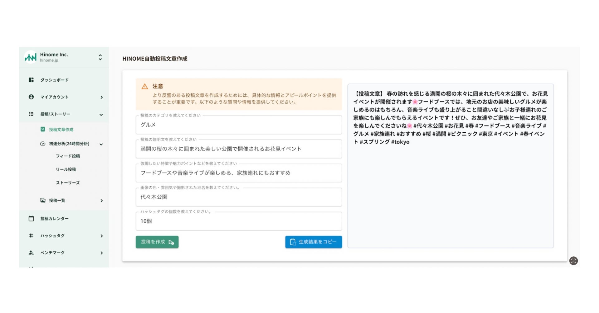 Hinomeは奈良県橿原市に本社を置き、”世の中の良いモノにヒノメがあたる社会”を目指し、2022年6月にInstagram分析ツール『HINOME』を完全無料で本リリースいたしました。リリース後、僅か8ヶ月で利用アカウント数10,000を突破し、多くの利用者の方々から関心・注目を浴びてまいりました。昨年6月の本リリースより1周年を迎え、さらに多くの利用者のご要望に応えるべく、新機能を掲載した有料の新プランをリリースいたしました。新機能は、事前に作成したコンテンツの投稿の予約ができる「投稿予約機能」、写真や動画を1つの場所で管理できる「ストレージ機能」、Chat-GPTと独自AIを活用した「投稿文章の自動作成機能」が利用可能です。今後もさらに開発を⾏っていく予定であり、より⼀層お客様にご満⾜いただけるツールとなっておりますので、ぜひご活⽤ください。