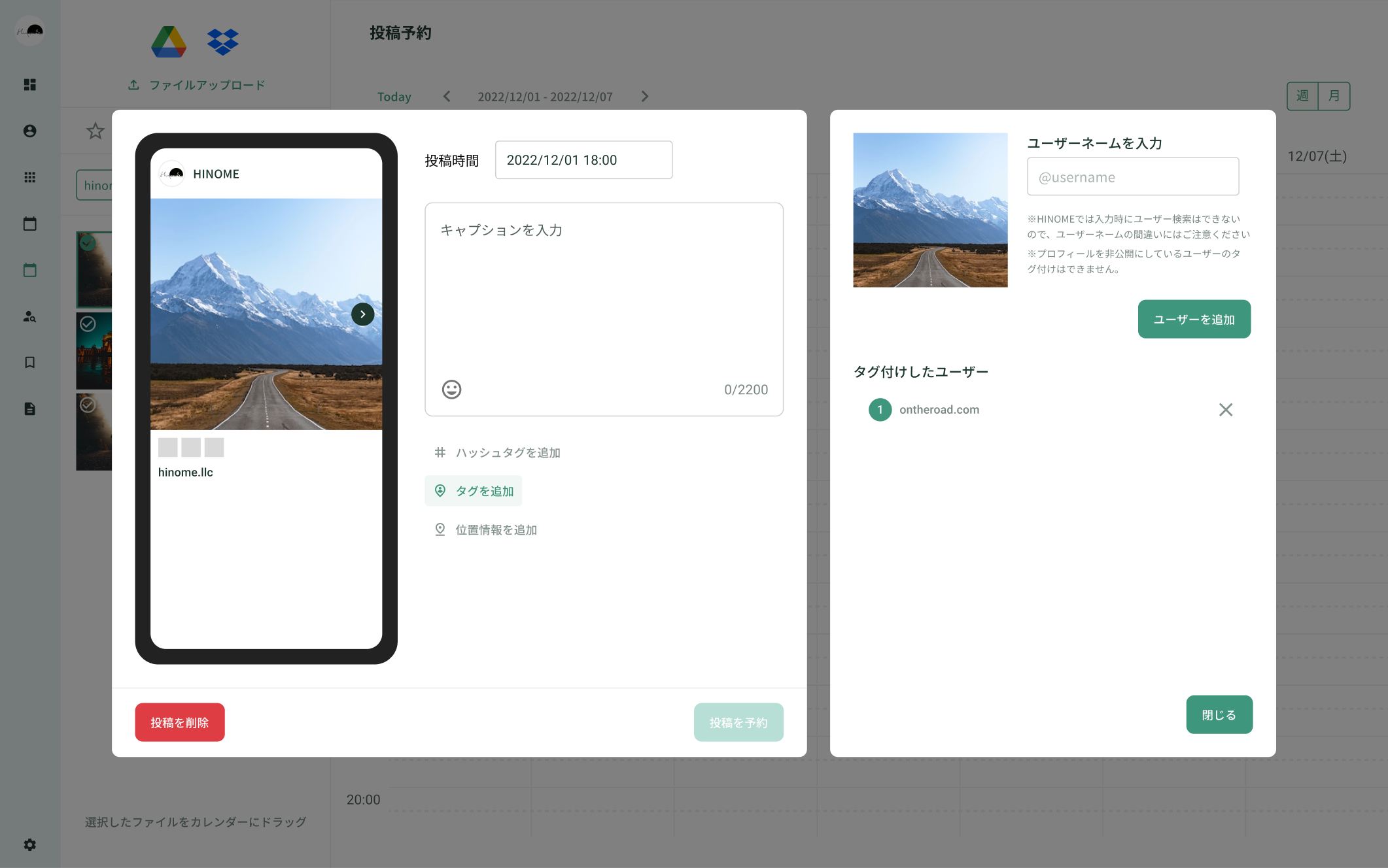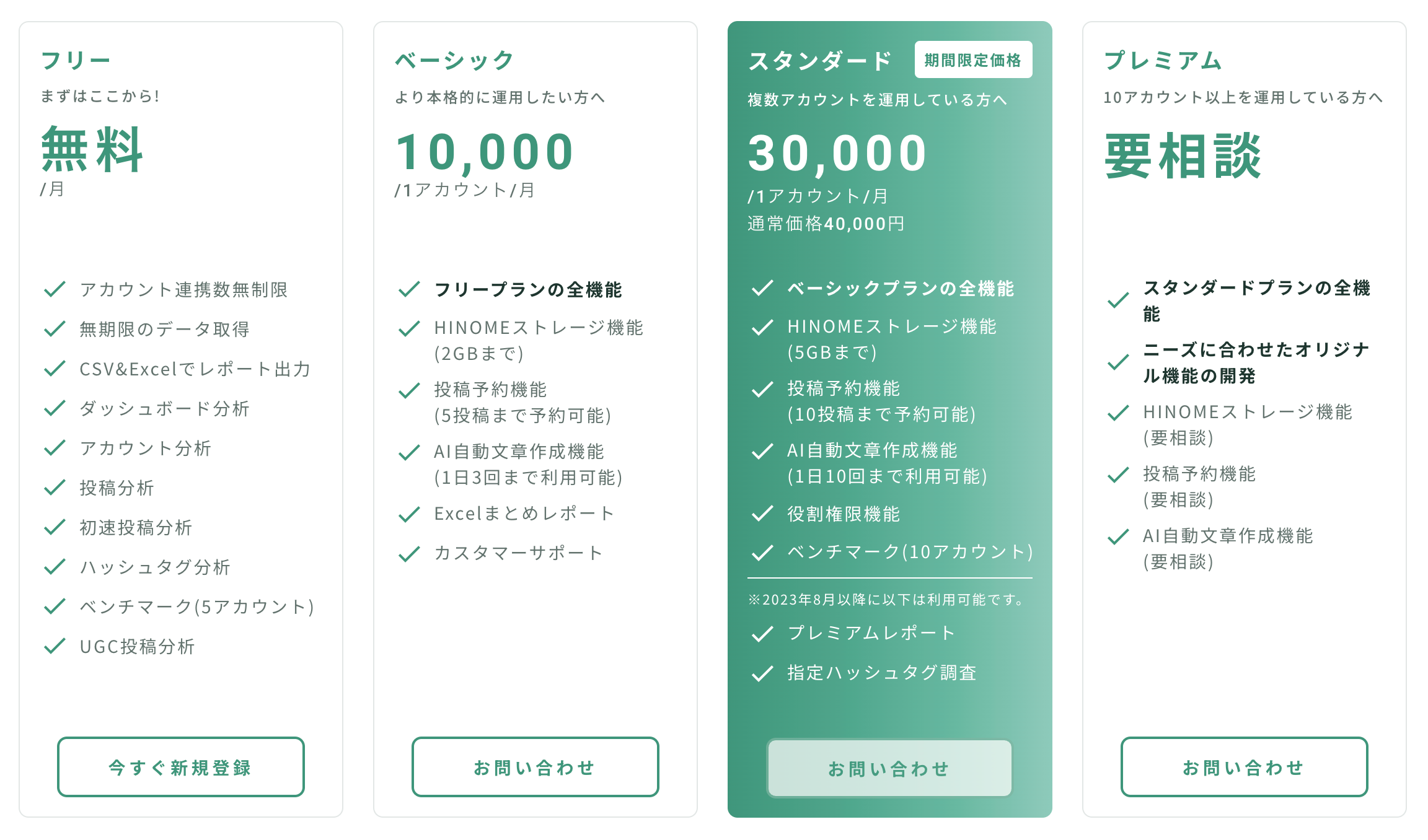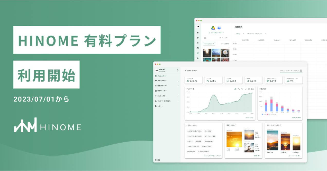 Hinomeは奈良県橿原市に本社を置き、”世の中の良いモノにヒノメがあたる社会”を目指し、2022年6月にInstagram分析ツール『HINOME』を完全無料で本リリースいたしました。リリース後、僅か8ヶ月で利用アカウント数10,000を突破し、多くの利用者の方々から関心・注目を浴びてまいりました。昨年6月の本リリースより1周年を迎え、さらに多くの利用者のご要望に応えるべく、新機能を掲載した有料の新プランをリリースいたしました。新機能は、事前に作成したコンテンツの投稿の予約ができる「投稿予約機能」、写真や動画を1つの場所で管理できる「ストレージ機能」、Chat-GPTと独自AIを活用した「投稿文章の自動作成機能」が利用可能です。今後もさらに開発を⾏っていく予定であり、より⼀層お客様にご満⾜いただけるツールとなっておりますので、ぜひご活⽤ください。