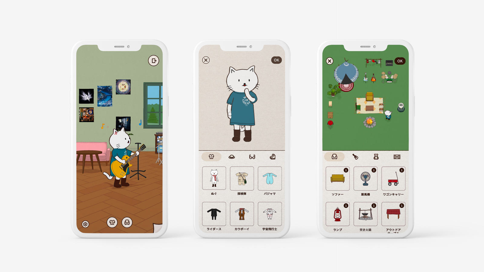 「be there」公式アプリでは、ユーザーのインタラクションによって表情を変え、気ままに楽器を演奏したり、たまに昼寝をする「ニコル」と共に、ゆるやかな時間を過ごすことができます。