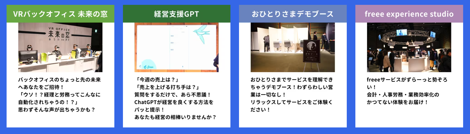 会場内にはちょっと先の“未来”を“楽しみ”ながら“体感”できる8つのコンテンツを用意しています。東京開催でも大変好評だった「インボイス駆け込み相談」では「インボイス登録申請ナビ」や「freee請求書|インボイス取引先管理」などを体験していただくことができ、現地でインボイス制度への対応が可能です。