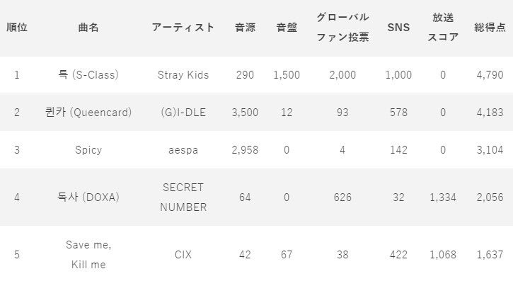 (※)各スコアの割合音源35%、音盤15%、グローバルファン投票(アプリ)20%、SNS10%、放送スコア20%