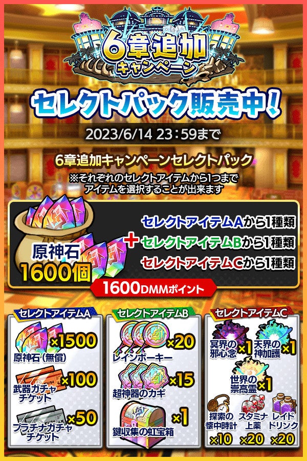 原神石に加えて、ガチャチケットや限界突破アイテムなど、好きなアイテムを選択できる「6章追加キャンペーンセレクトパック」がショップに登場!