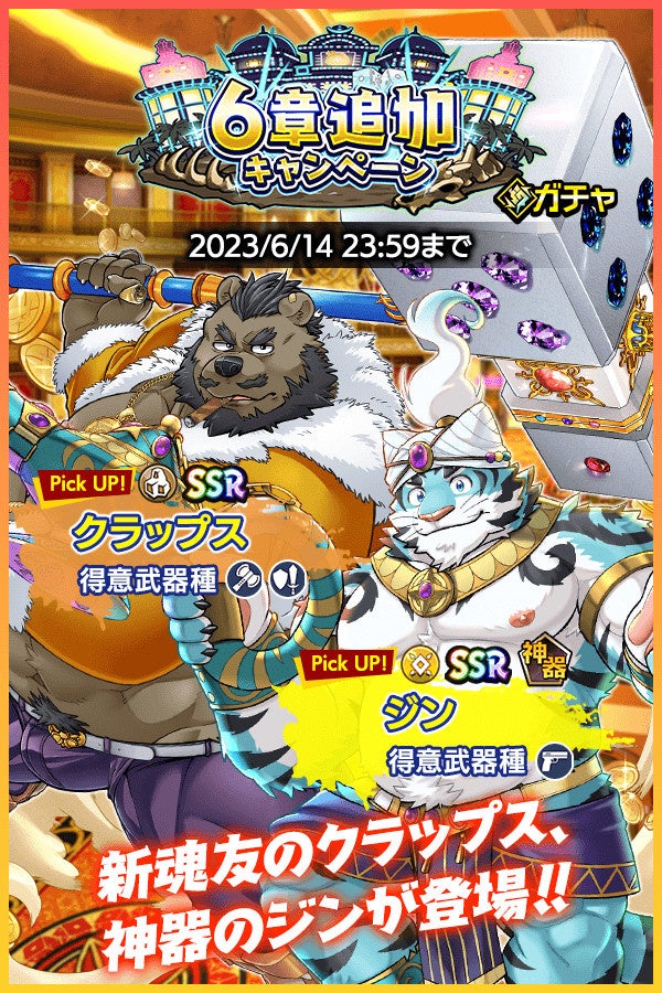 SSR魂友「クラップス」とSSR神器「ジン」がピックアップされた「6章追加キャンペーンガチャ」もお見逃しなく。