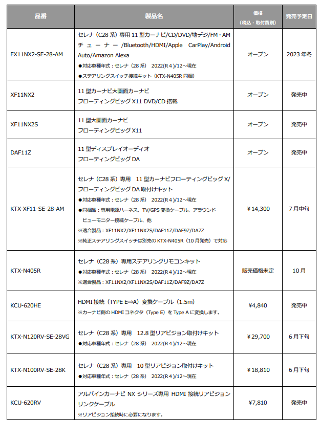 電子部品、カーエレクトロニクス関連製品の開発・製造・販売を行うアルプスアルパイン株式会社(東京都大田区、栗山 年弘社長)と、その国内マーケティング部門であるアルパインマーケティング株式会社(東京都大田区、石田 宗樹社長)は、日産・新型セレナ専用となる車種専用11型大画面カーナビ(今冬発売予定)を発表。フローティング ビッグX11やリアビジョン取付けキットも6月下旬より順次、全国のアルパイン製品取扱店にて販売を開始いたします。