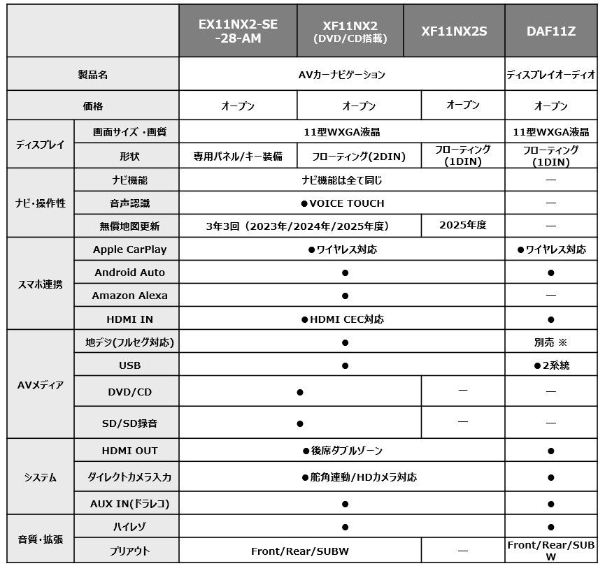 < 新型セレナ専用11型大画面モデル 主要機能比較 >