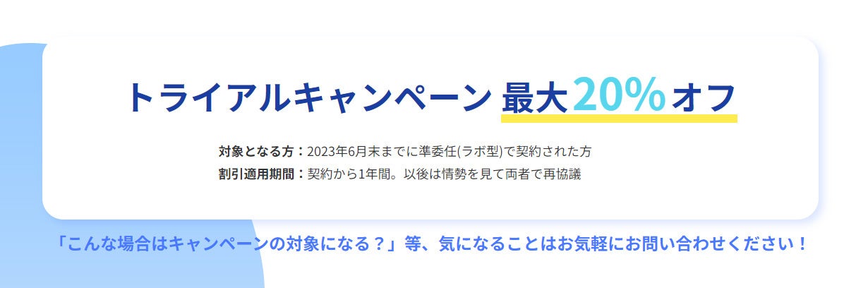 2023年6月末までに準委任で申込(契約)された方は費用を最大20%オフとさせていただきます。
