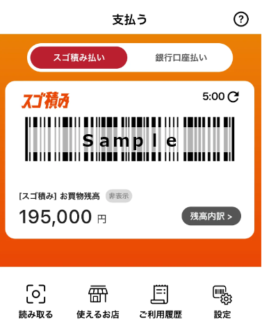 本年7月より、積み立ての満期を迎えられたお客様の決済利用が開始となります。アプリ上で[スゴ積み払い]を選択後、レジでバーコードを提示し、店舗スタッフがレジ端末で読み取ることで決済が完了します。アプリ上でご利用履歴および残額の確認も可能となります。