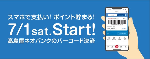 株式会社高島屋(本社:大阪市中央区、代表取締役社長:村田 善郎、以下「高島屋」)と、住信SBIネット銀行株式会社(本社:東京都港区、代表取締役社長(CEO):円山 法昭、以下「住信SBIネット銀行」)は、2023年7月1日(土)から「高島屋ネオバンク」を活用したバーコード決済サービスの提供を開始いたします。