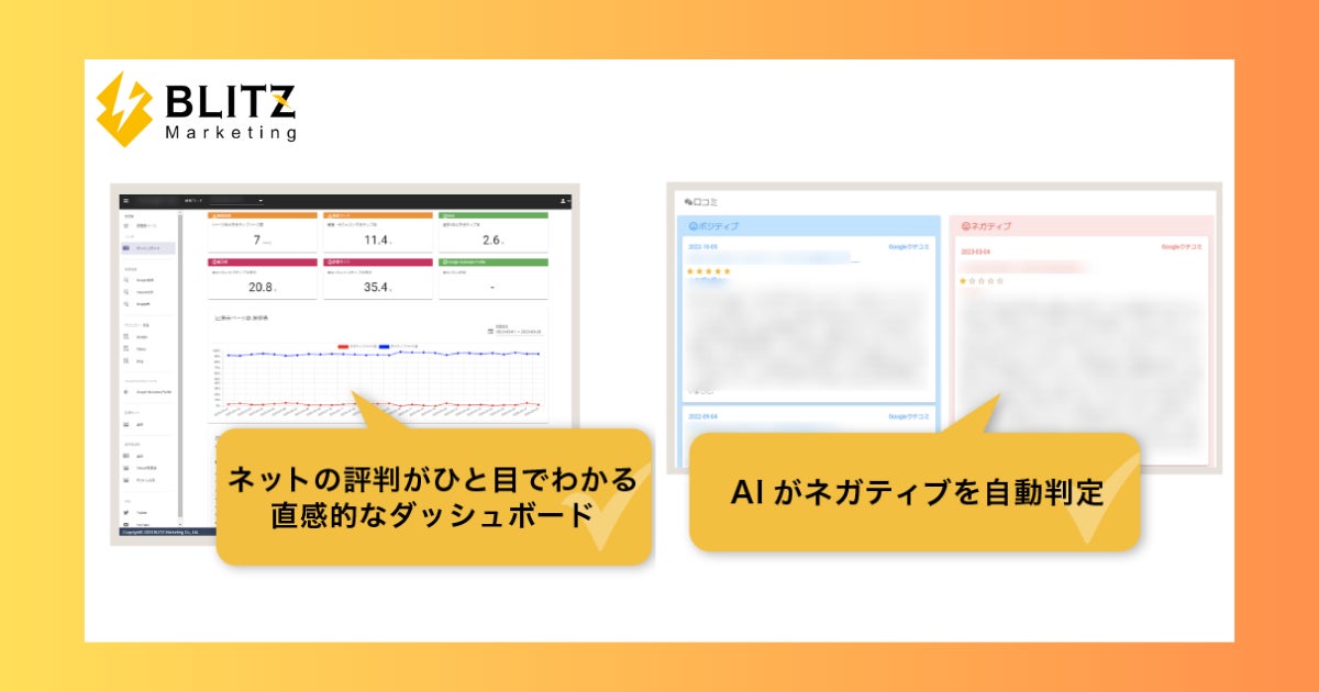 株式会社BLITZ Marketingは、1,000社以上の企業に対しWebブランディングの課題を解決するマーケティングカンパニーです。各分野のエキスパートが様々な専門的アプローチでクライアント様のWebブランディングをサポートします。さらに、ネット上の評判や情報が企業価値・イメージに大きな影響力を持つ現代に合わせ、お客様のネット上の情報を管理・改善するためのレピュテーションリスク対策に特化したツールを提供しています。