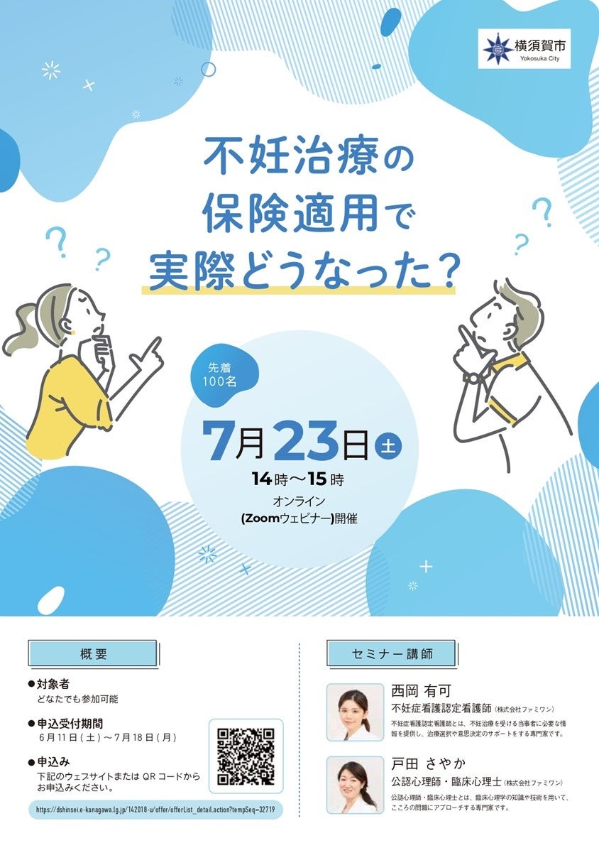 今回のセミナーでは、2022年4月からの不妊治療の保険適用に関して、最新の情報を交えて解説します。ファミワンの不妊症看護認定看護師の西岡有可と臨床心理士の戸田さやかを講師に、保険適用化された治療・保険適用化されない治療、保険適用化の条件などを紹介しながら、実際の自己負担額がどのくらいかシミュレーションも行います。